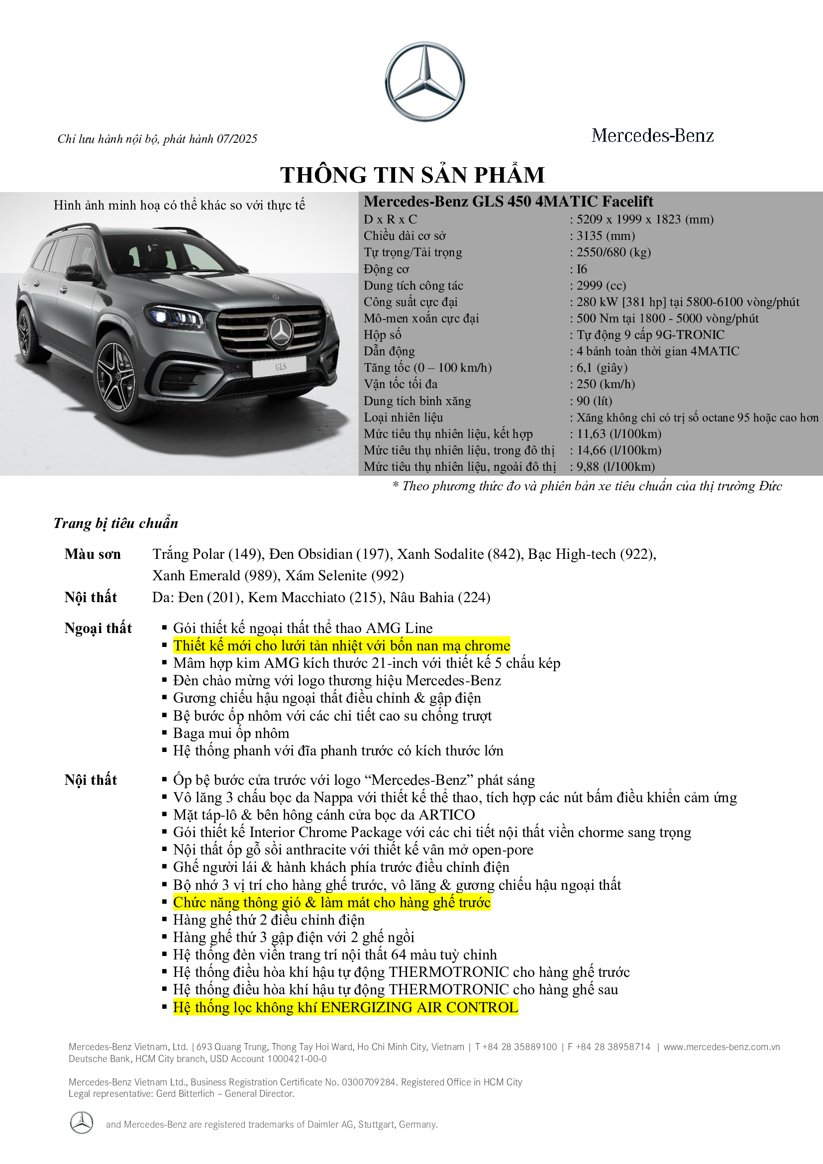 Mercedes-Benz GLS 450 4MATIC Facelift 2025 là mẫu SUV đầu bảng của thương hiệu “Ngôi sao ba cánh”, mang đến trải nghiệm đẳng cấp dành cho giới doanh nhân và gia đình thượng lưu. Với không gian 7 chỗ rộng rãi, công nghệ hiện đại và khả năng vận hành mạnh mẽ, GLS 450 FL được ví như “S-Class của SUV” – một chuyên cơ mặt đất thực thụ.