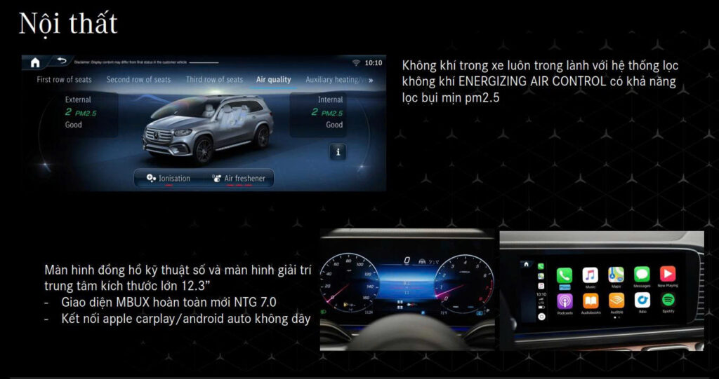 GLS 450 2025 trang bị hệ thống giải trí MBUX thế hệ mới với hai màn hình 12.3 inch, hỗ trợ Apple CarPlay™ & Android Auto™ không dây. Ngoài ra còn có: